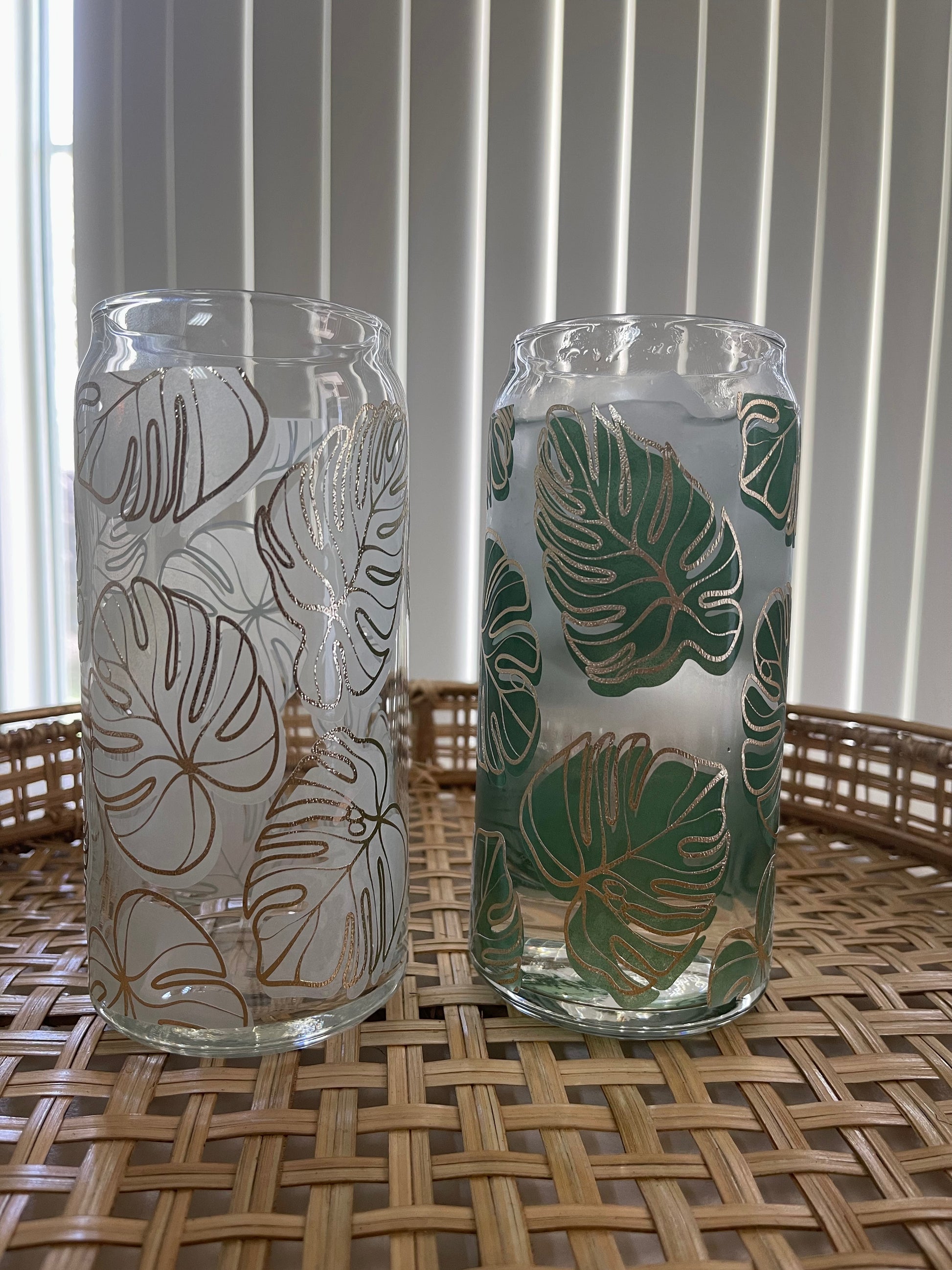 Monstera changing libbey beer can glass cup | COLD COLOR CHANGING | Translucent to Dark Green with Gold outline | NEW NEW